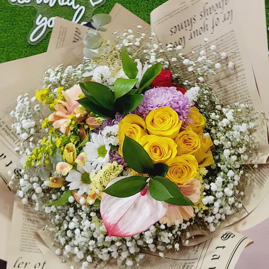 Un hermoso bouquet compuesto de 8 rosas amarillas, gerberas, y variedad de flores y complementos.
