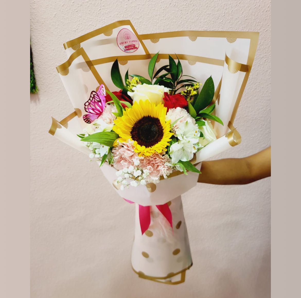 Hermoso arreglo compuesto de rosas, claveles y un hermoso girasol sin duda el detalle perfecto para tu persona favorita