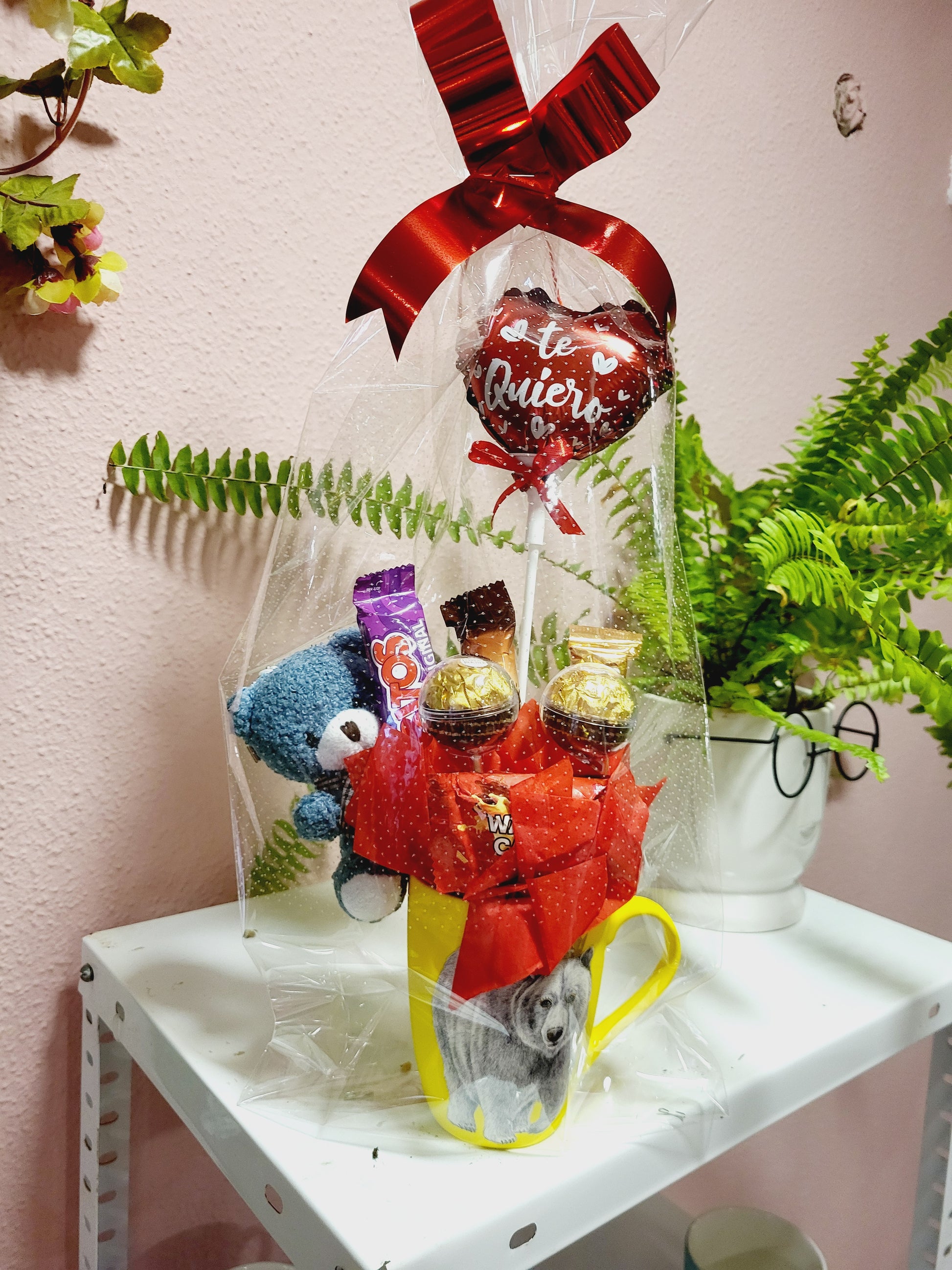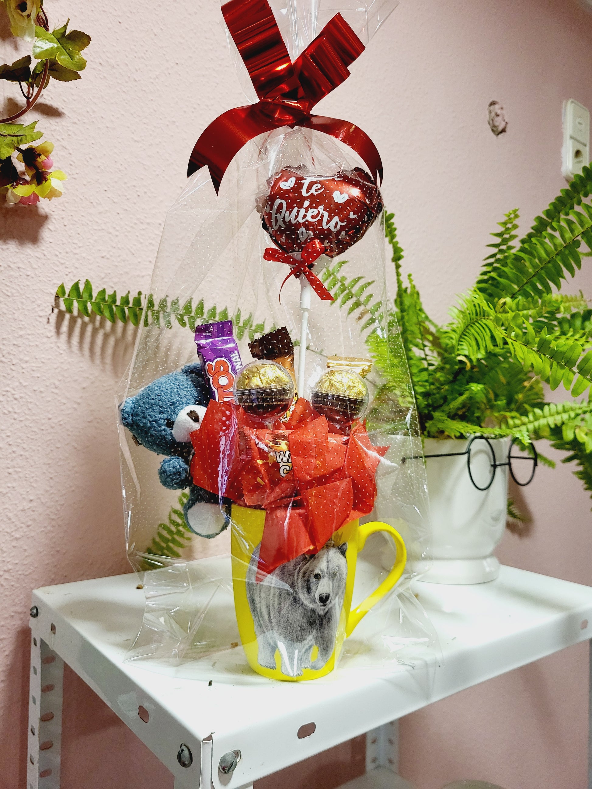 Celebra San Valentín con nuestro Siempre Tú! Arreglo de taza de animales o personalizada con la foto que elijas, llena de dulces y un pequeño oso lleno de amor. Haz que este día sea aún más especial con este tierno detalle. ¡Sorprende a tu pareja con un regalo único y lleno de amor!