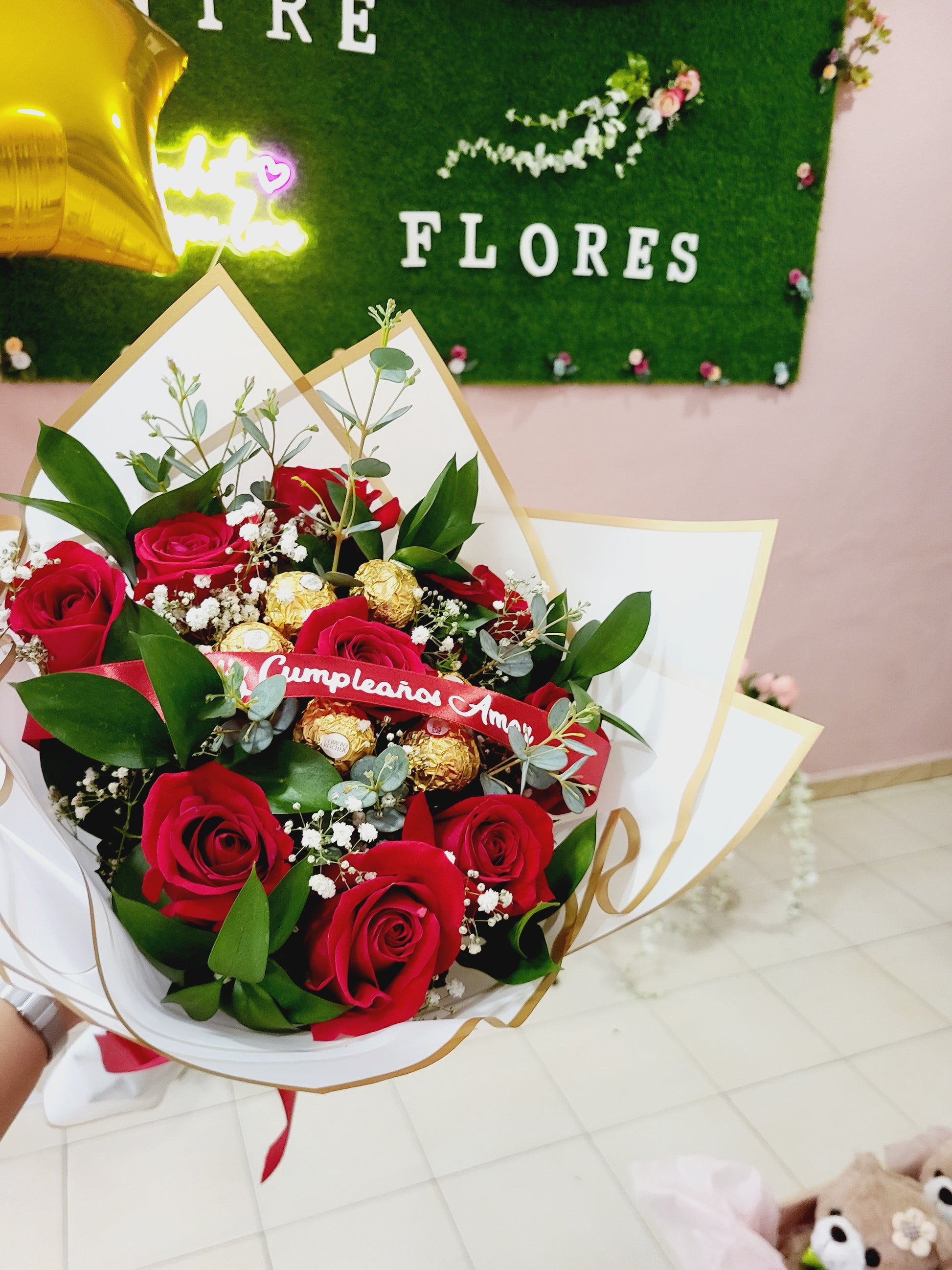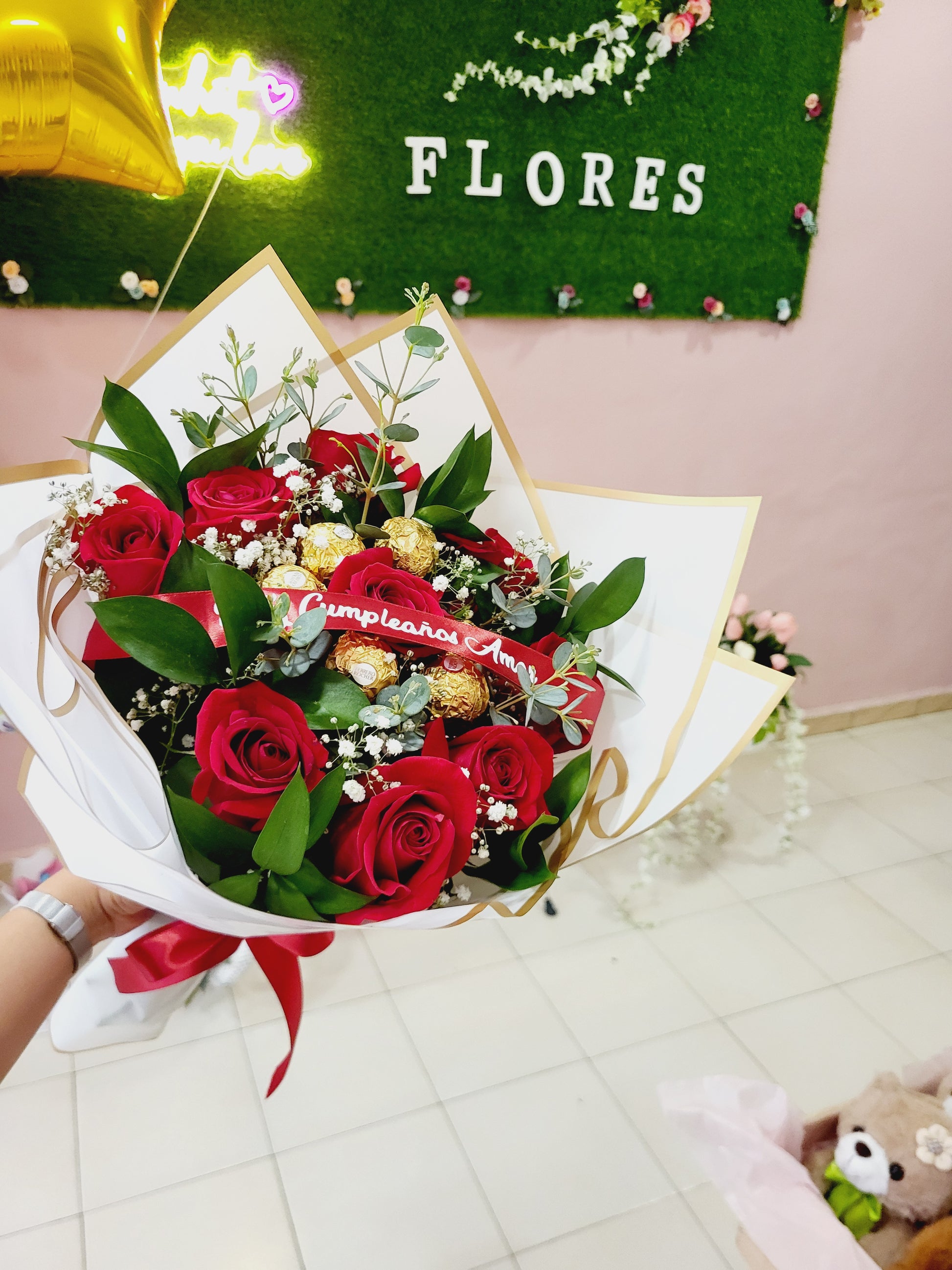 Encanto bouquet compuesto por 9 rosas y 7 chocolates ferrero, eucalipto y ruscus!