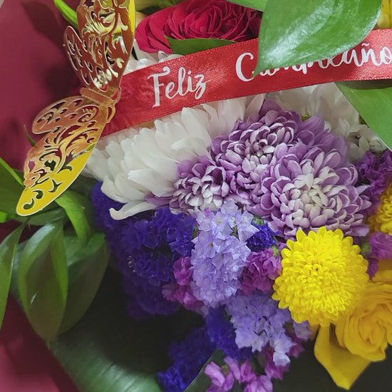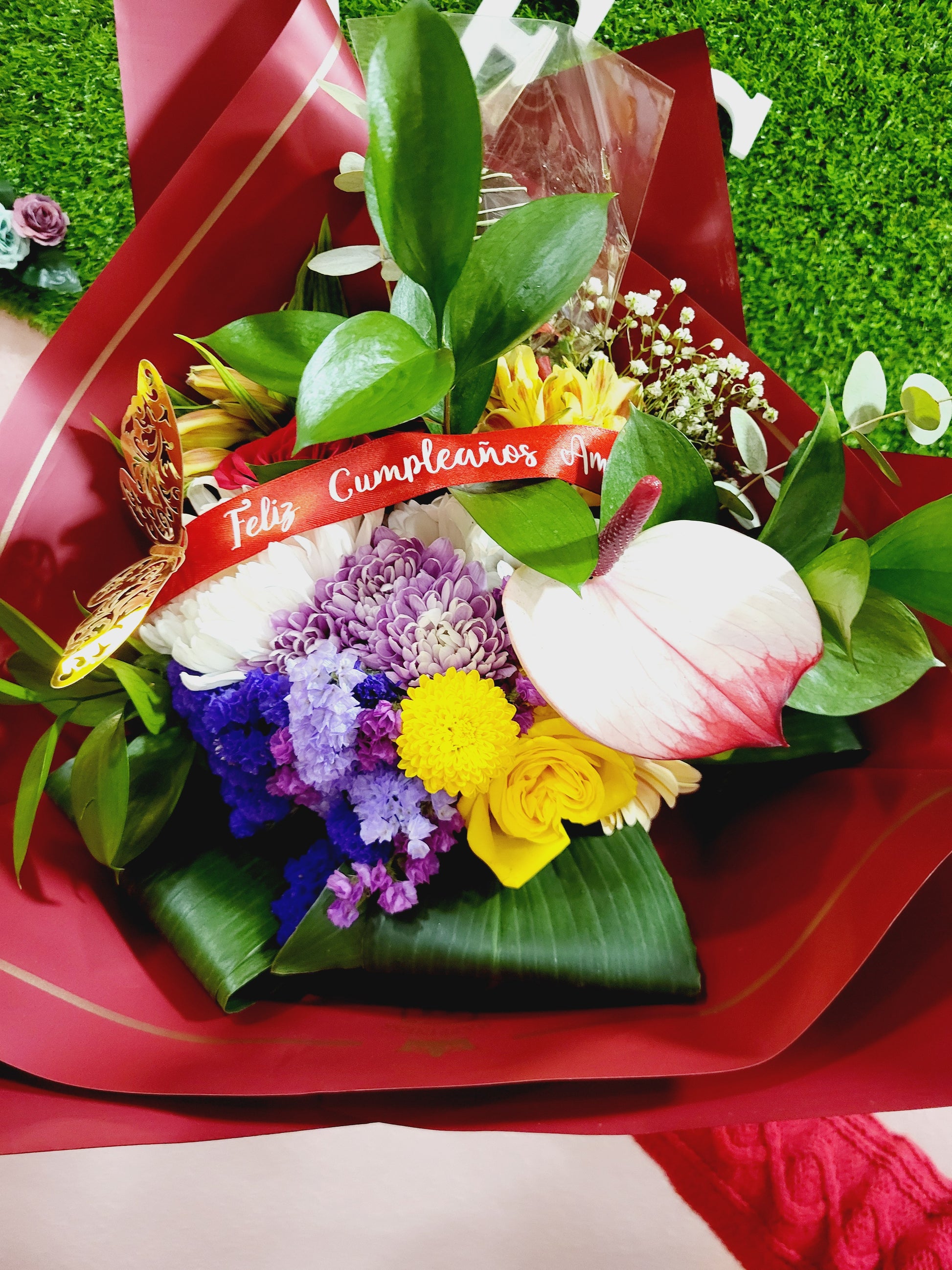 Hermoso bouquet de Cumpleaños con envoltura roja y dedicatoria personalizada en cinta