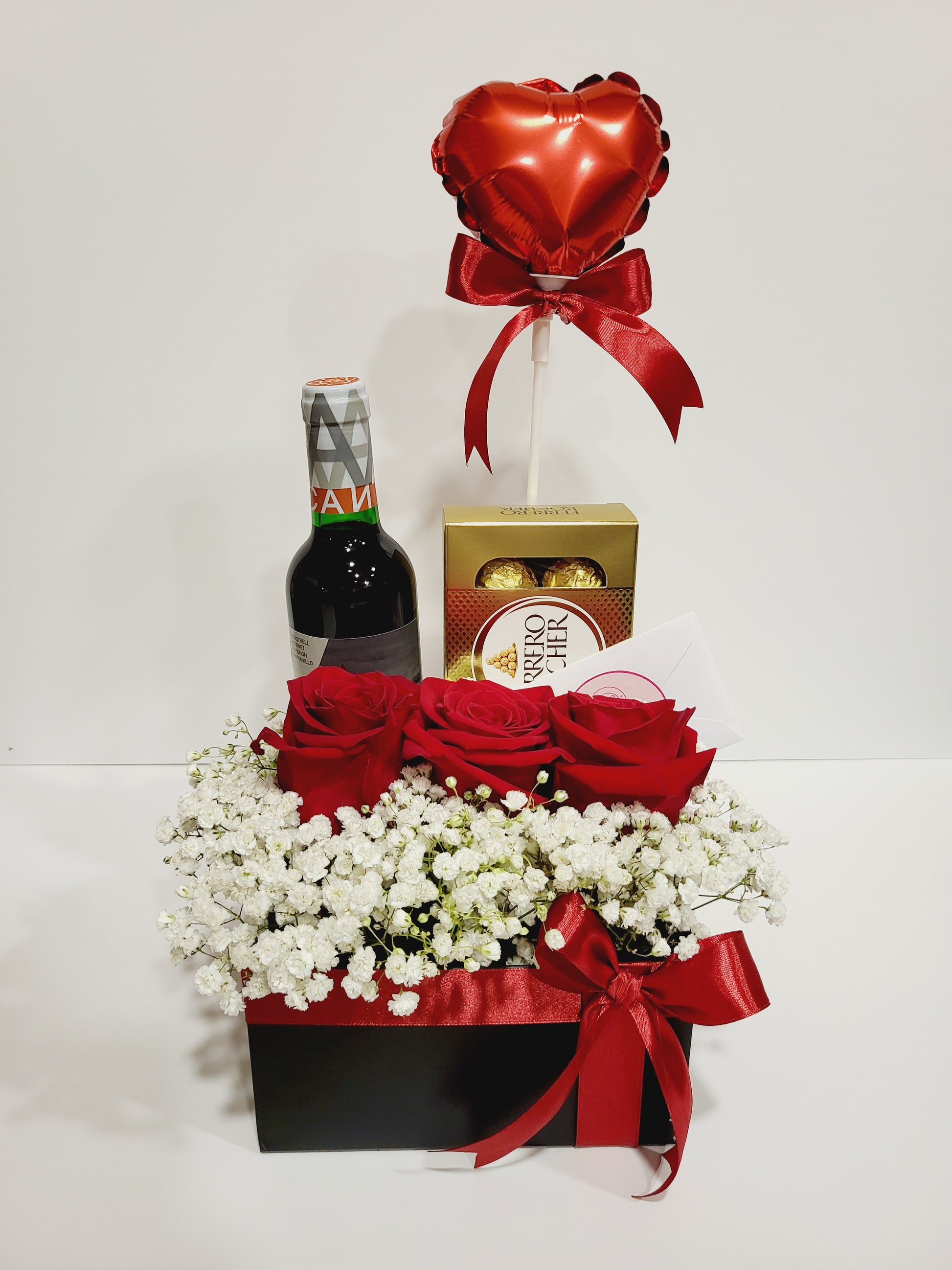 Caja de regalo con rosas naturales, chocolates y vino. ¡Un regalo perfecto para celebraciones!