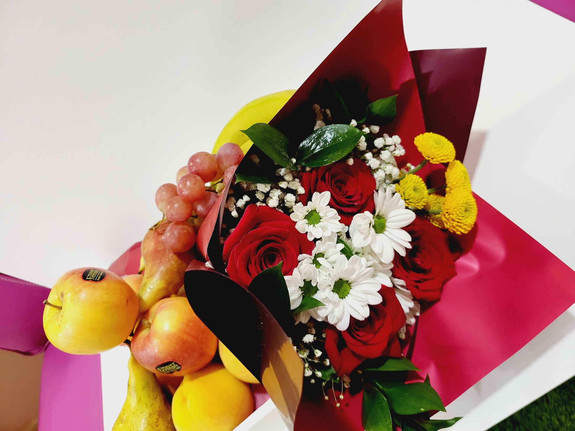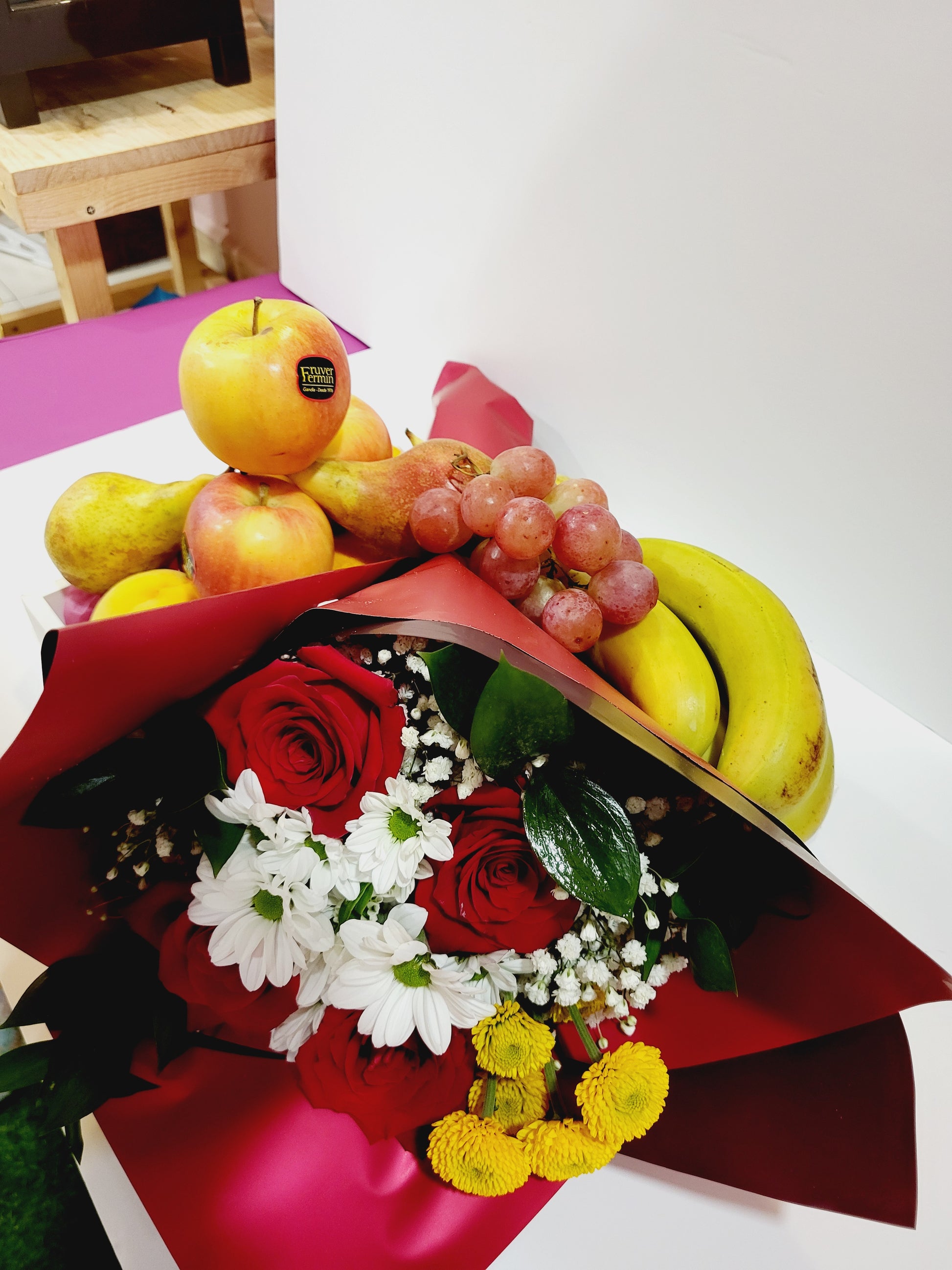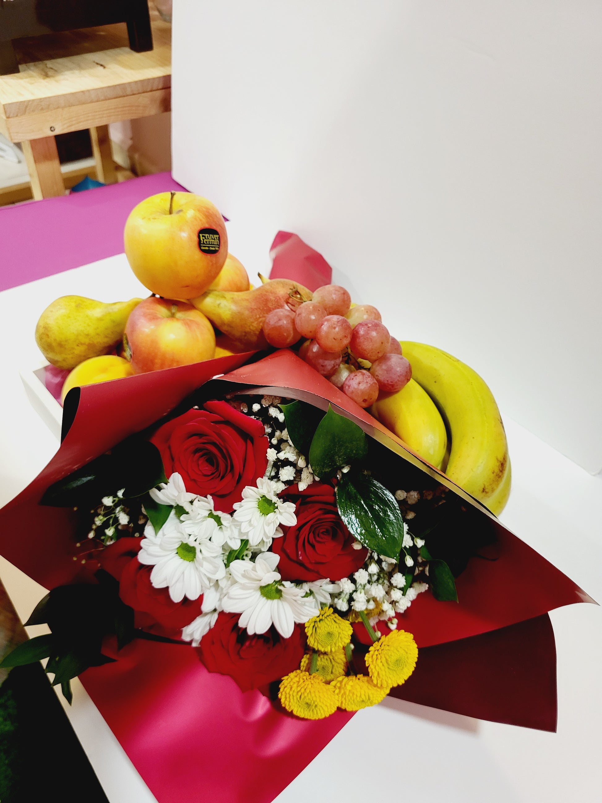 Este Encantador arreglo combina la frescura de las frutas de temporada con la elegancia de un hermoso ramo de flores, creando así un detalle perfecto ideal para cualquier ocasión especial.
